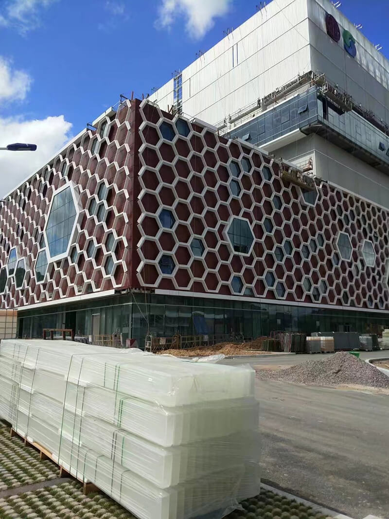 蜂巢狀玻璃幕墻的設(shè)計(jì)靈感來源于蜜蜂把花粉釀蜜的過程。設(shè)計(jì)師把每天奔波在城市中的眾多垃圾回收車輛比喻蜜蜂收集花粉的過程,把生活垃圾焚燒發(fā)電廠比喻蜂巢,將收集的生活垃圾在焚燒發(fā)電廠變成清潔能源的過程比喻蜜蜂釀蜜,非常形象的展現(xiàn)了康恒寧波鄞州垃圾焚燒發(fā)電廠的建造理念。