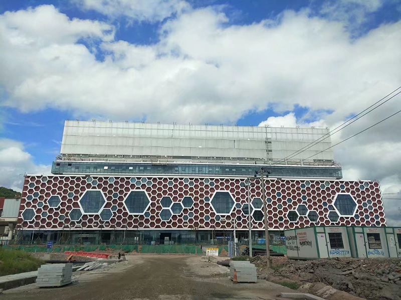 建筑設(shè)計(jì):法國(guó)建筑大師設(shè)計(jì),蜂巢狀透視玻璃幕墻,顏色鮮明的六邊形飾塊,幾何狀層次分明的主體建筑,110米高塔樓式煙囪。