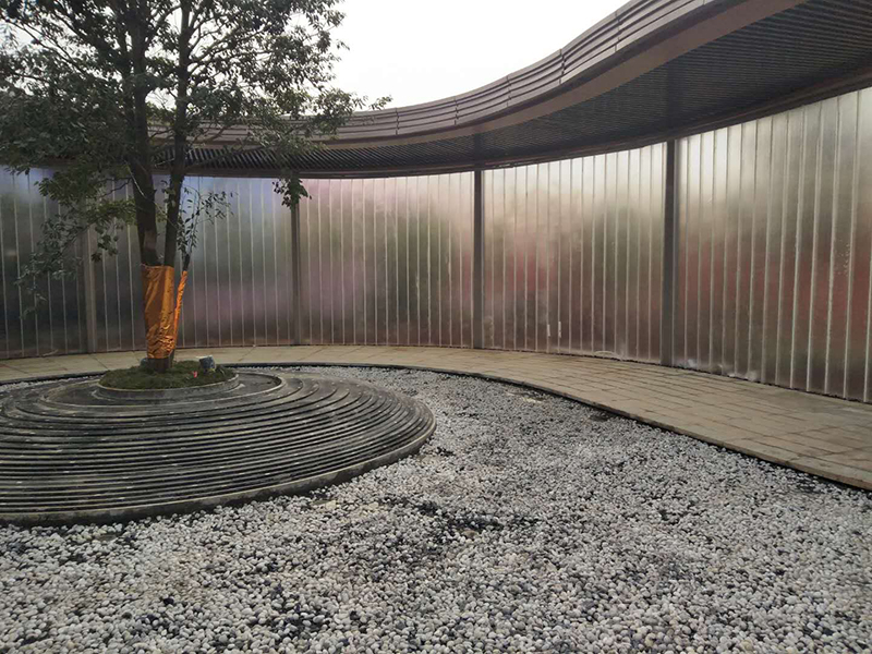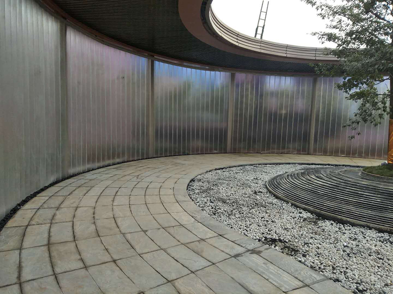 圓弧U型玻璃整個墻面透視模糊墻外的事物,外面看里面,里面看外面都像一風(fēng)景畫!