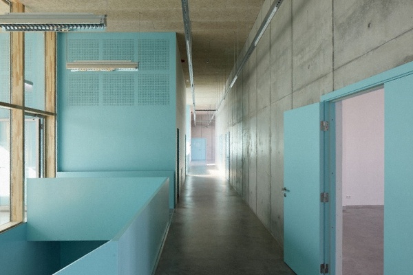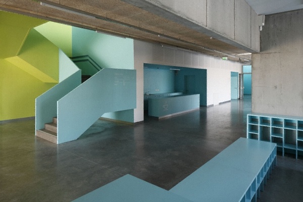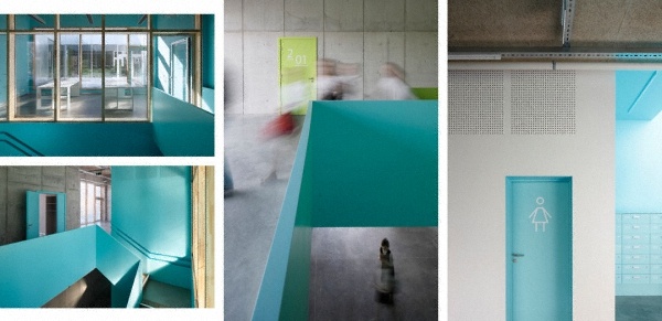 (右)藝術(shù)學(xué)校更衣區(qū)域細部。各種材料,色彩簡單明快的和諧共處。導(dǎo)識系統(tǒng)經(jīng)過精心設(shè)計。