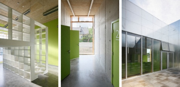 外觀。停車場緊靠建筑入口。在建筑入口做了一個大挑檐。部分采光庭院沿外側(cè)布置。