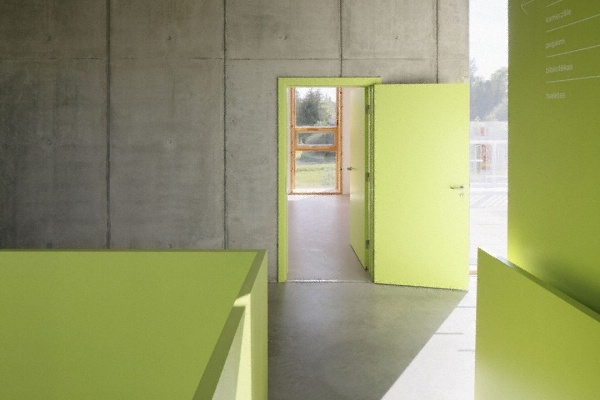 充滿陽光的音樂學(xué)院公共空間。暴露的混凝土與精致光滑的果綠配色在陽光下清新明快。