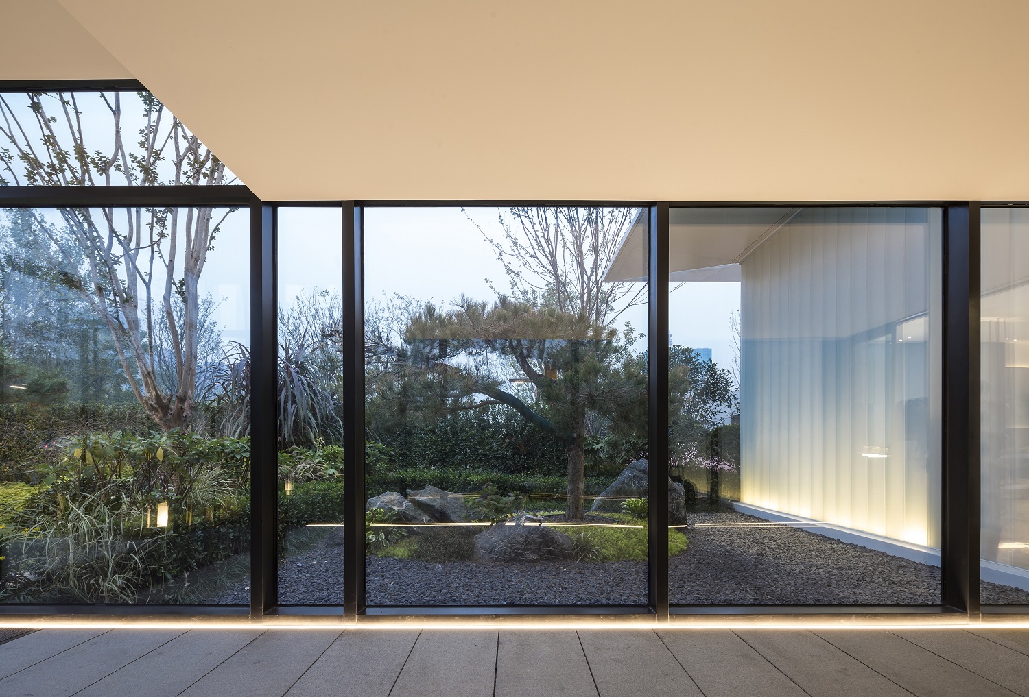 隱隱約約的光影是來自自然的饋贈,亦是室內(nèi)最美的裝飾?!癠”形玻璃的運(yùn)用,把光影請進(jìn)了室內(nèi),由內(nèi)而外,讓樹影婆娑,爬滿建筑,讓光影成為四季的??汀?/p>
