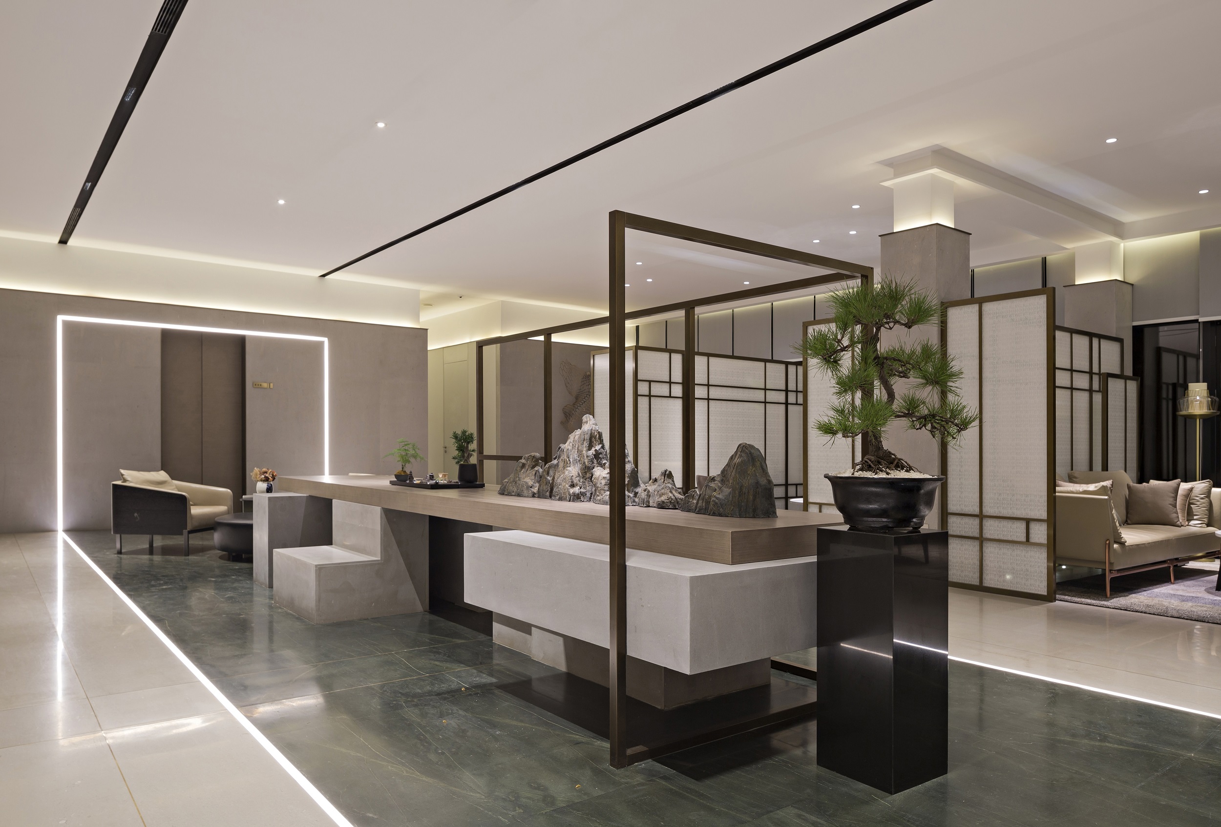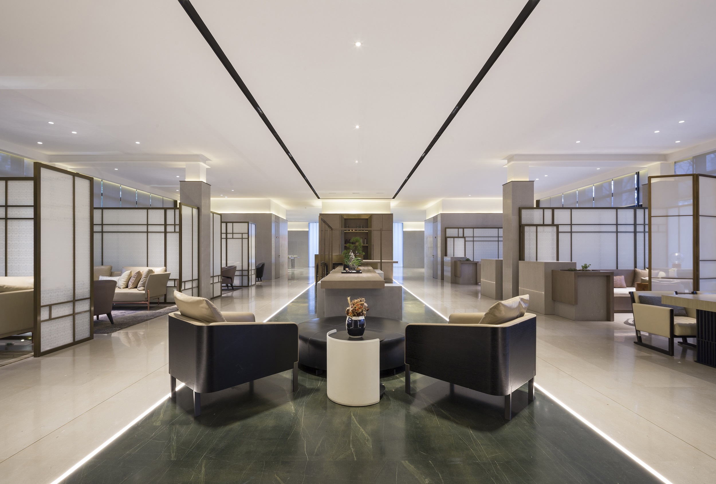 在一個大道至簡的空間內(nèi),利用線面之間的交織重疊,它可以是燈帶、燈的形態(tài)等,這些簡約的線型演繹,將視覺延伸到立體的空間中。