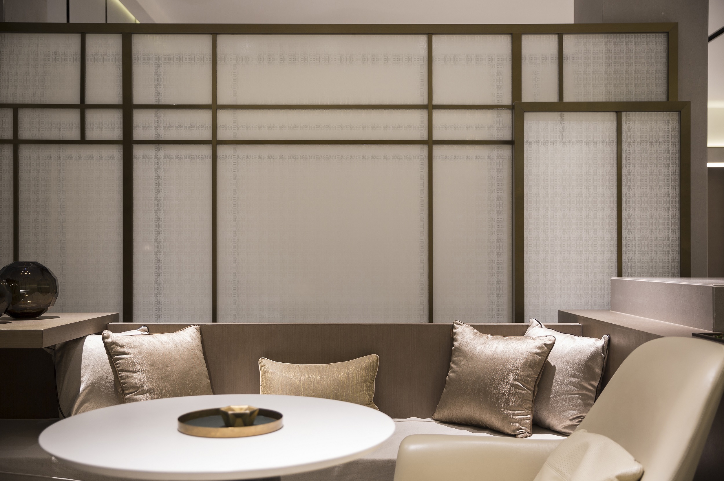 半通透的夾絲玻璃的巧妙運(yùn)用,使間隔開的洽談區(qū)域在視覺上依然是一個整體,借助視線的隱約,感知空間的隱喻,萌生溫暖的向往。